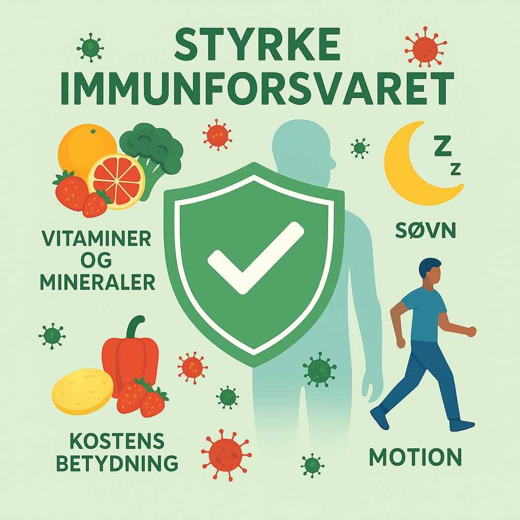 2. **Motion**: Regelmæssig fysisk aktivitet forbedrer cirkulationen af immunceller og styrker immunfunktionen. Det anbefales at dyrke moderat motion i mindst 150 minutter om ugen.